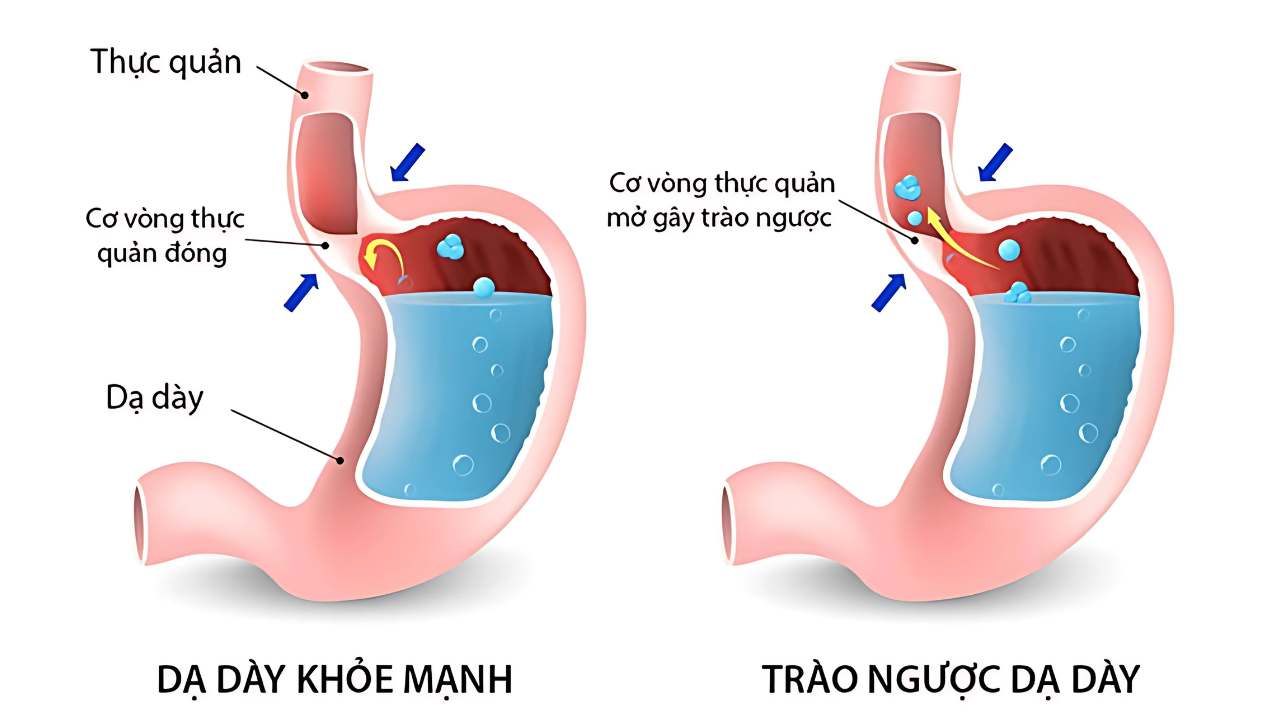 Tình trạng trào ngược dạ dày thực quản xảy ra khi cơ thắt thực quản dưới bị yếu hoặc giãn không đúng lúc, khiến dịch dạ dày chảy ngược vào thực quản. Điều này gây ra các triệu chứng liên quan đến đường tiêu hóa, khoang miệng, họng và đường hô hấp, chẳng hạn như cảm giác nóng rát ở ngực, ợ nóng, ợ chua. Các tình trạng thường xuất hiện sau khi ăn và nặng hơn vào ban đêm. Ngoài ra, các triệu chứng khác như đau ngực, khó nuốt, ho nhiều, viêm thanh quản, hen suyễn mới phát hoặc trở nên nghiêm trọng hơn và rối loạn giấc ngủ.